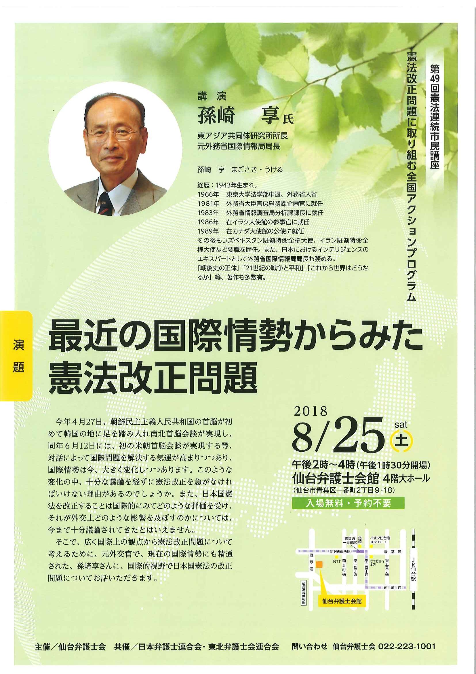 【憲法連続市民講座のお知らせ】最近の国際情勢からみた憲法改正問題【日時:2018年8月25日 午後2時~午後4時 場所:仙台弁護士会館4階】