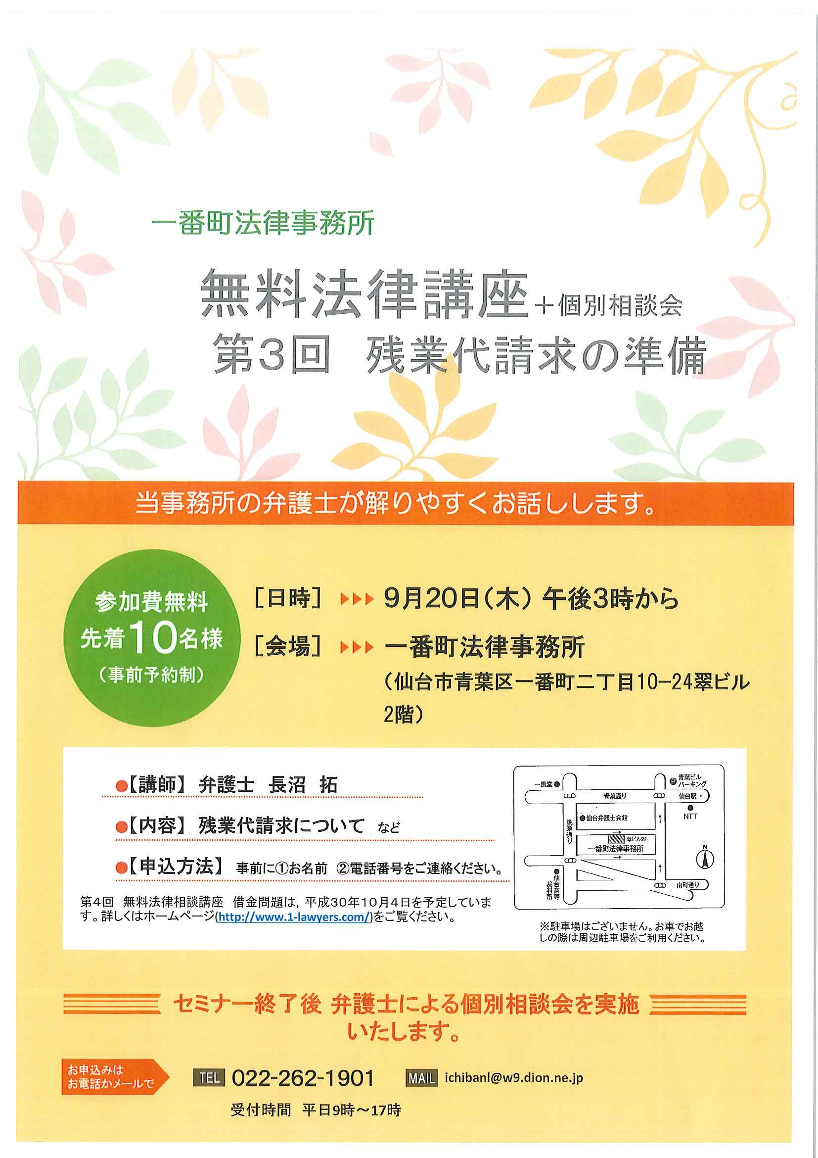 【無料法律講座のお知らせ】第3回 残業代請求の準備【日時:9月20日(木)午後3時~ 場所:一番町法律事務所】 - 仙台 弁護士 一番町法律事務所