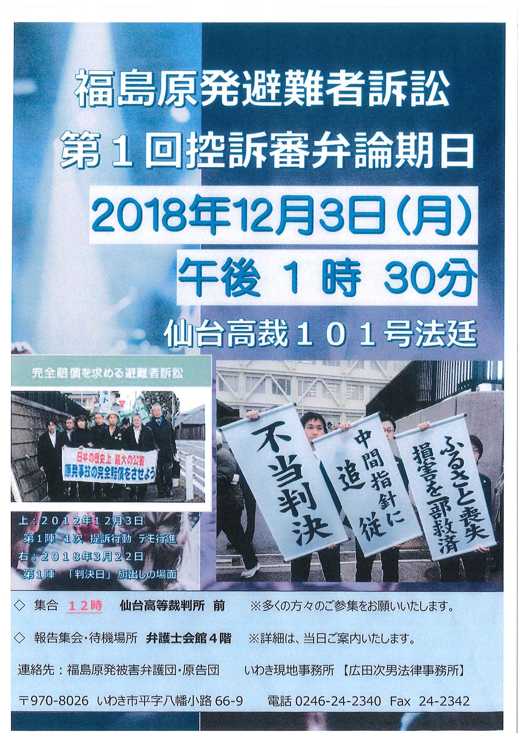 【裁判のお知らせ】福島原発避難者訴訟第1回控訴審弁論期日【日時:2018年12月3日(月)午後1時30分 場所:仙台高裁101号法廷】