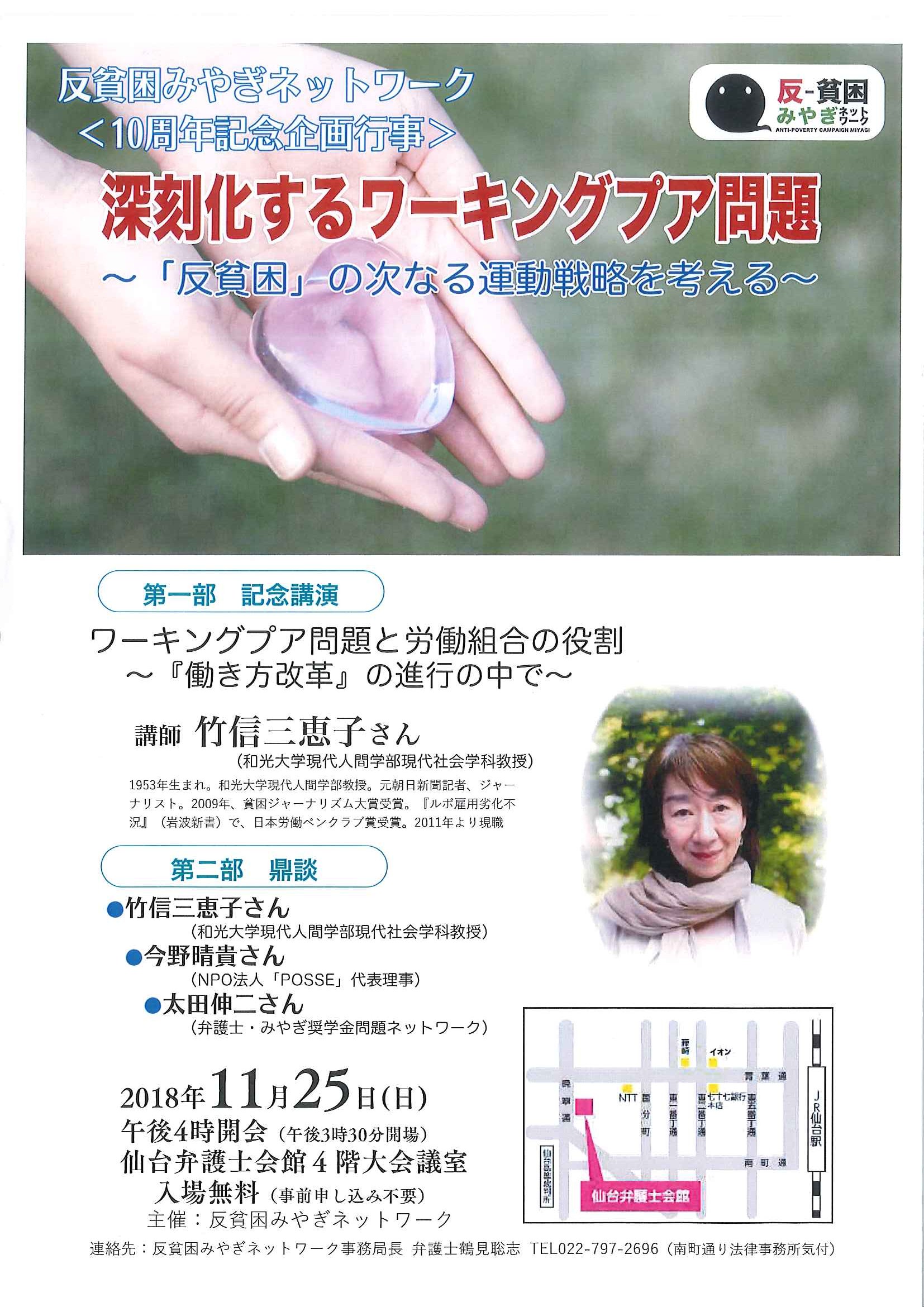 【シンポジウムのお知らせ】深刻化するワーキングプア問題~「反貧困」の次なる運動戦略を考える~【日時:2018年11月25日(日)午後4時~ 場所:仙台弁護士会館4階】